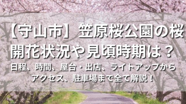 さくら祭り・桜の名所・花見スポット【守山市】笠原桜公園の桜2024年の開花状況や見頃時期は?ライトアップ、駐車場まで全て解説! この記事では滋賀県守山市のお花見スポット、笠原桜公園の桜2024年の開花状況や見頃時期、イベントの日程、時間、場所などの基本情報から屋台・出店、ライトアップ、アクセス、駐車場情報まで全て分かりやすく解説します。さくら祭り・桜の名所・花見スポット