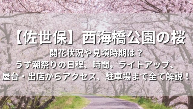 さくら祭り・桜の名所・花見スポット【佐世保】西海橋公園の桜2025年の開花状況や見頃時期は?うず潮祭り、屋台・出店、駐車場、ライトアップまで全て解説! この記事では長崎県佐世保市の人気花見スポット、長崎県立西海橋公園の桜の2025年の開花状況や見頃時期、うず潮まつりなどのイベントの日程、時間、場所などの基本情報からライトアップ、屋台・出店、アクセス、駐車場情報まで全て【地元民が】分かりやすく解説します。さくら祭り・桜の名所・花見スポット
